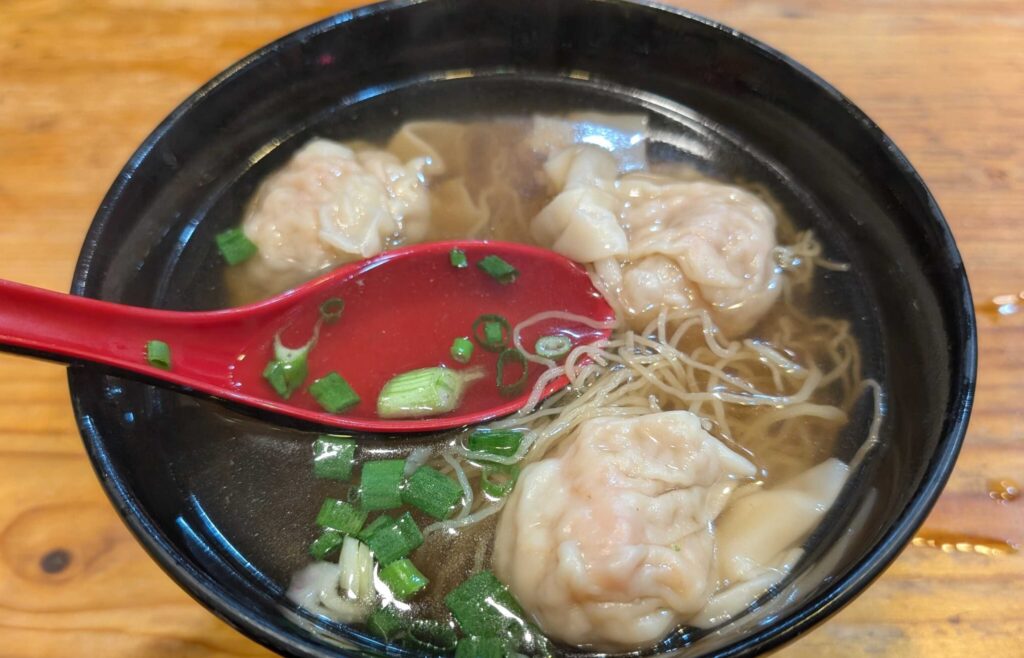 香港特有の固めの麺と、とっても美味しい海老ワンタンがゴロっと乗っています。